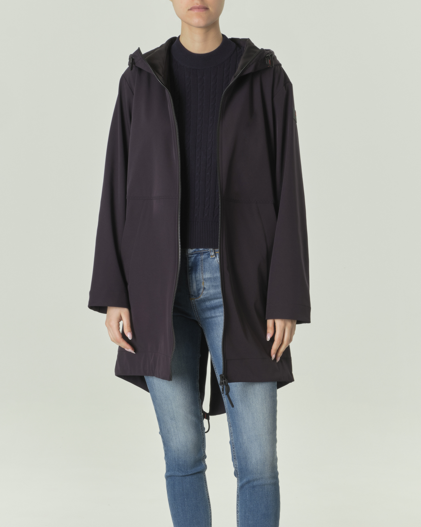 Parka nero in nylon stretch accoppiato con cappuccio e fondo a coda di rondine Very well made.